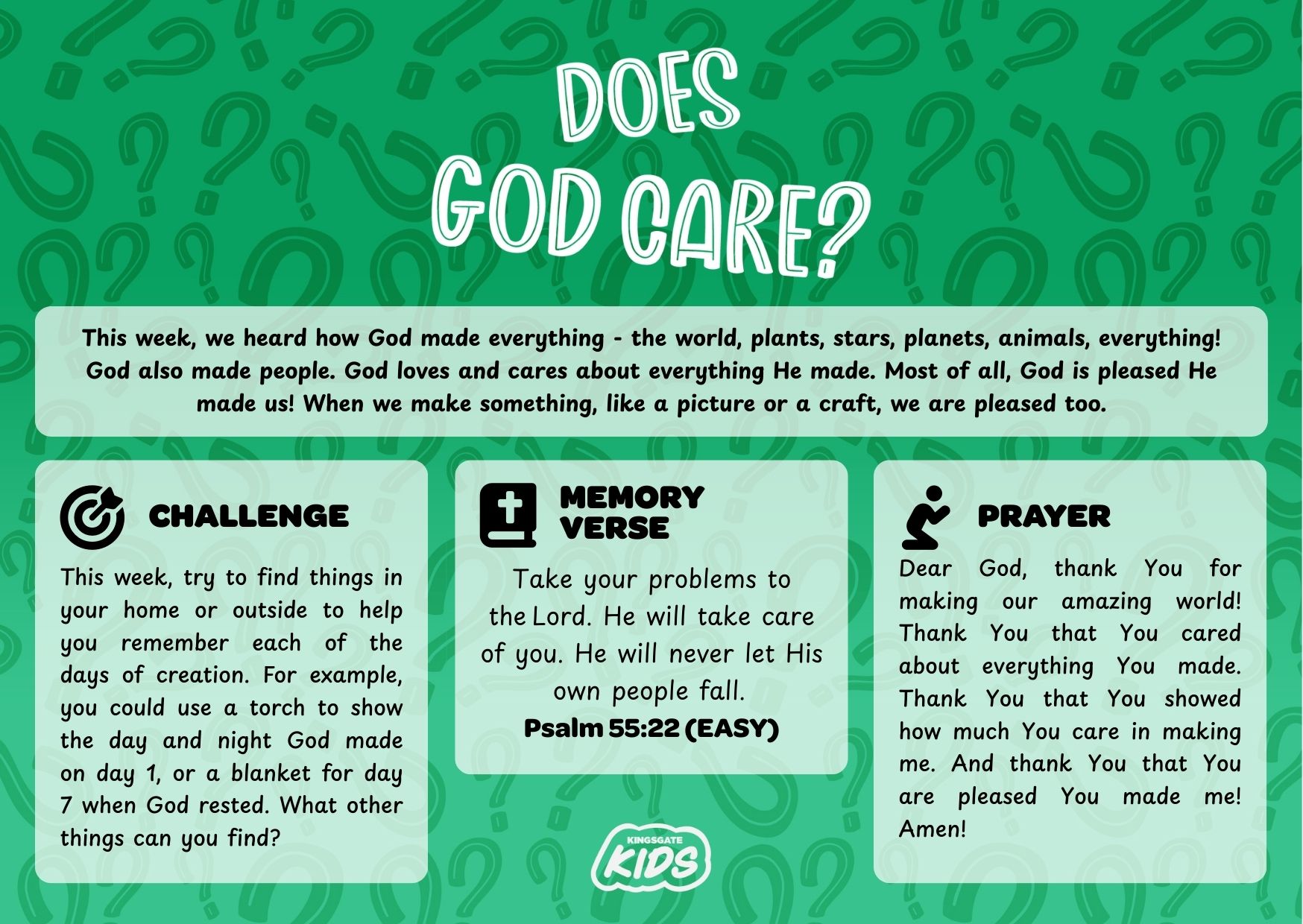 Dear God, thank You for making our amazing world! Thank You that You cared about everything You made. Thank You that You showed how much You care in making me. And thank You that You are pleased You made me! Amen!