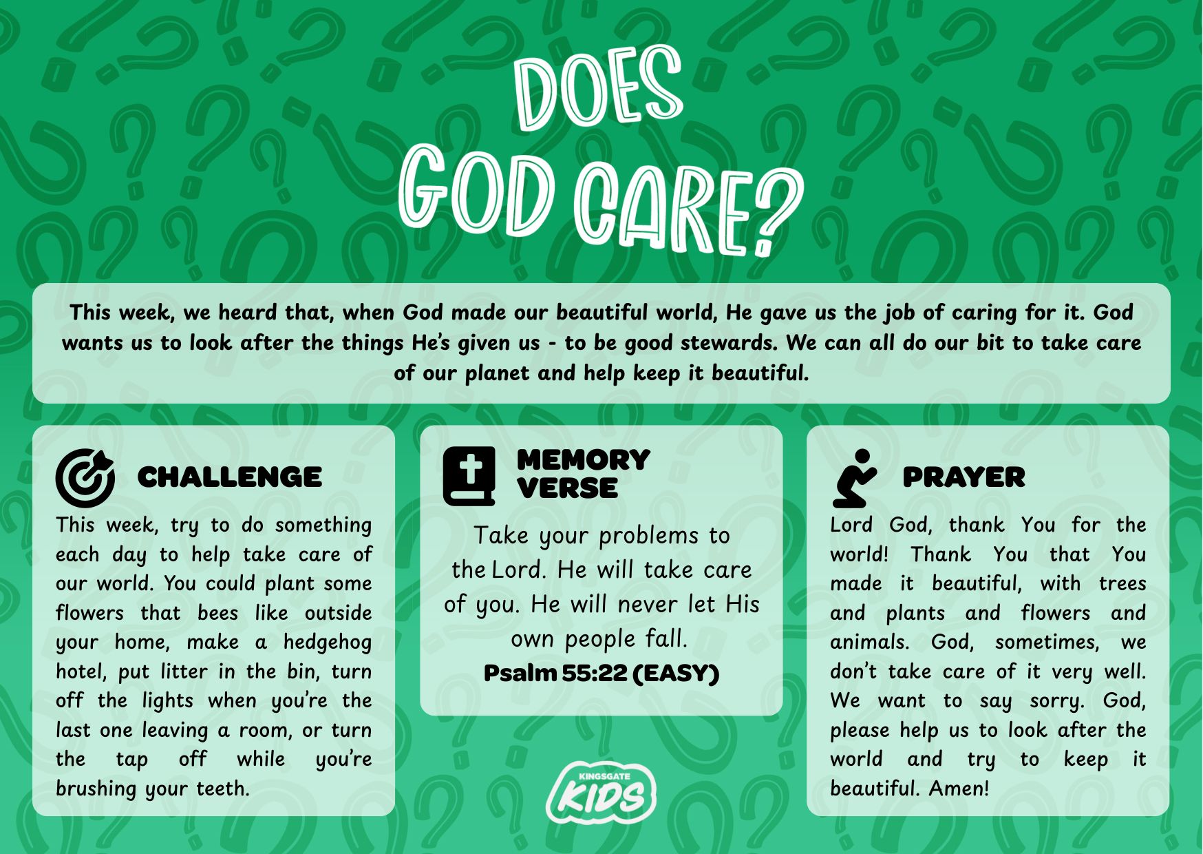 Lord God, thank You for the world! Thank You that You made it beautiful, with trees and plants and flowers and animals. God, sometimes, we don’t take care of it very well. We want to say sorry. God, please help us to look after the world and try to keep it beautiful. Amen!