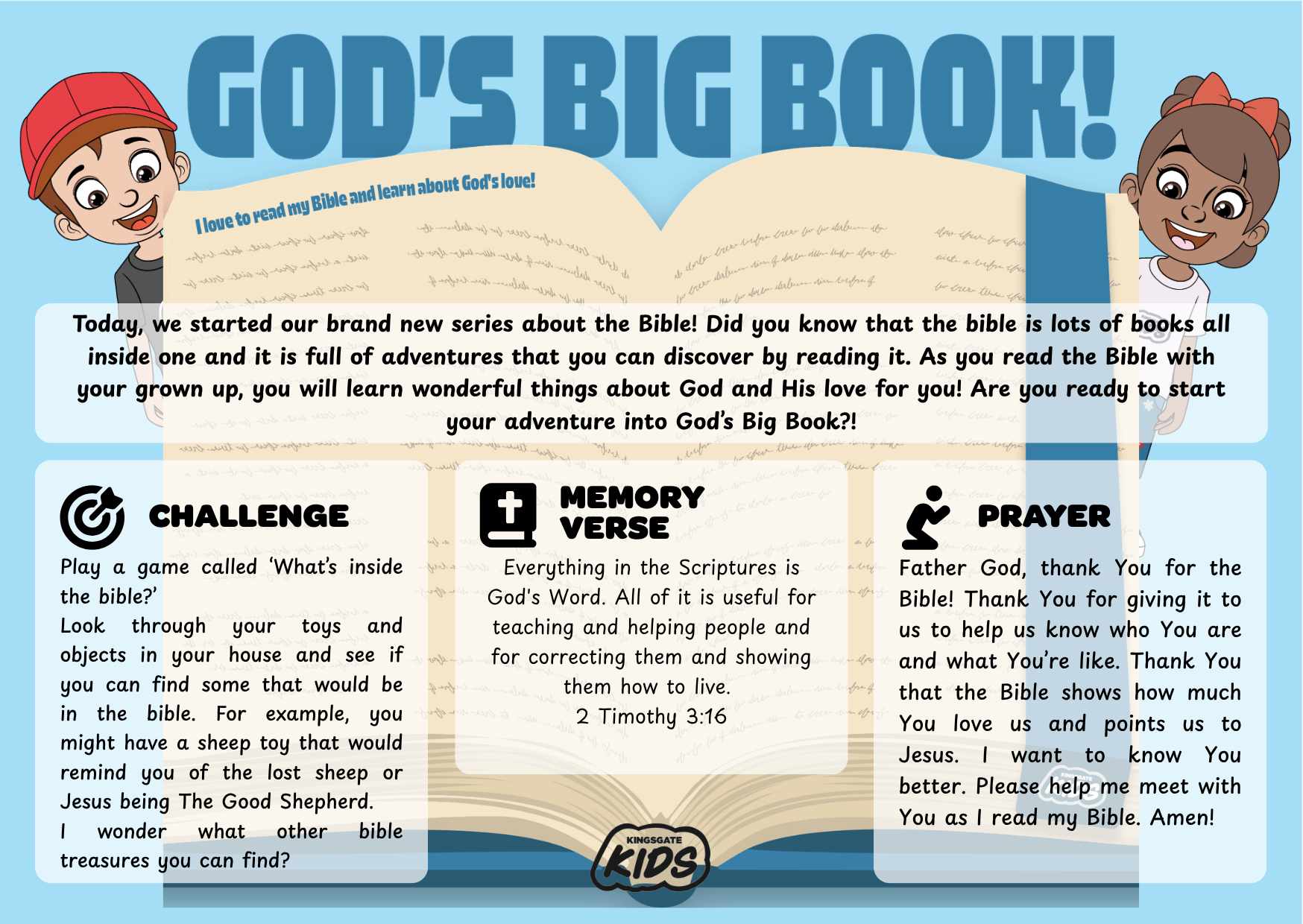Father God, thank You for the Bible! Thank You for giving it to us to help us know who You are and what You’re like. Thank You that the Bible shows how much You love us and points us to Jesus. I want to know You better. Please help me meet with You as I read my Bible. Amen!