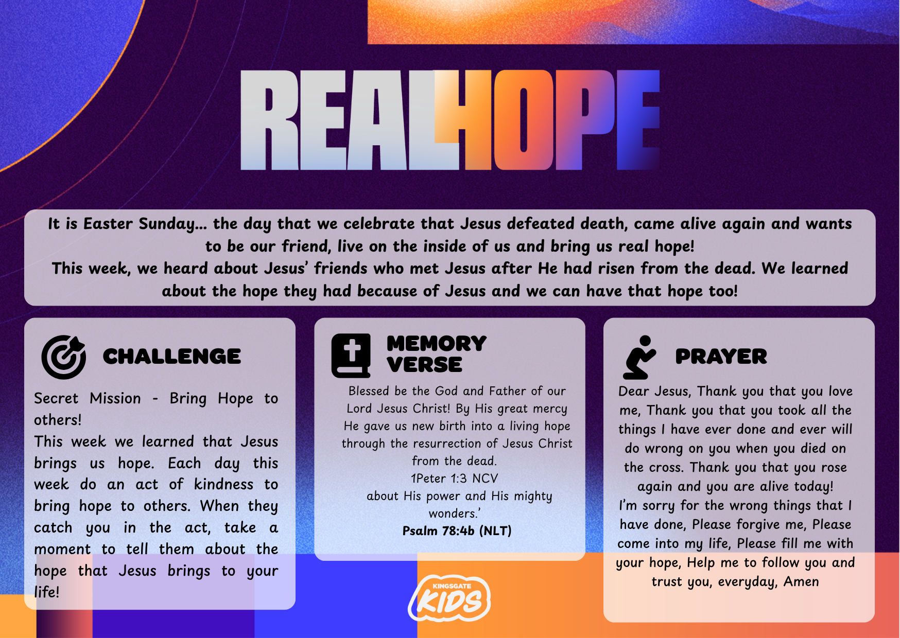 Dear Jesus, thank you that you love me. Thank you that you took all of the things that I have ever done and ever will do wrong onto you when you died on the cross. Thank you that you rose again and you are alive today! I’m sorry for the wrong things that I have done, please forgive me. Please come into my life, please fill me with your hope. Help me to follow you and trust you everyday Amen.