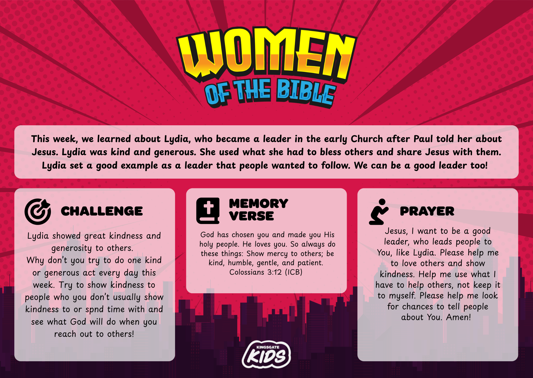 Jesus, I want to be a good leader, who leads people to You, like Lydia. Please help me to love others and show kindness. Help me use what I have to help others, not keep it to myself. Please help me look for chances to tell people about You. Amen!